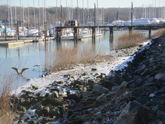 • Short sharp January freeze thawed already.  Seems strange to see the harbor so empty, prepared for bad weather that seems perpetually predicted next week.  People are equally confused, some in heavy coats, others jogging in shorts.  Plants as uncertain as humans, but ducks are probably just happy to have so much open water.