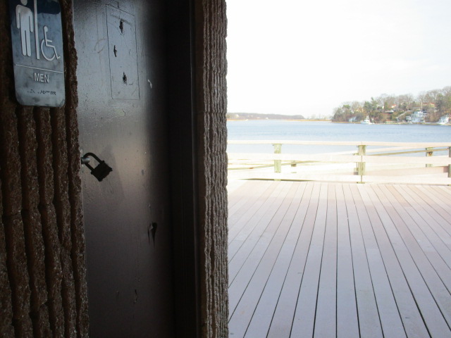 • Restrooms locked.  Picnic area cleared.  Lifeguard chair removed, toll booth vacant.  Mostly, sand and playground are devoid of people as well.  On nice days, or if cabin fever has built too high, small children very bundled run around the open beach.  Every day _ rain, shine, sleet, snow, bitter wind, or raging storm _ someone will be in the parking lot, often not leaving warm dry car, letting their dog or dogs experience the outdoors.