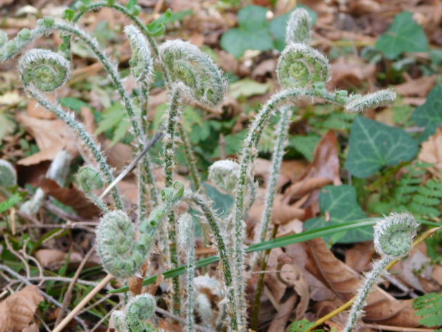 • Ferns uncoiling from beds of leaves are almost alien forms.  So unlike the buds and blossoms and leaves of everything else except fungi, they astound with an alternate vision of renewal.  Fossils reveal an ancient lineage, ferns were here long before any flowering plants, covered lands before animals emerged from the sea.  Even now, they need no help for pollination or dispersal of spores, using only wind.  Easily ignored, yet beautiful in garden and woods everywhere.