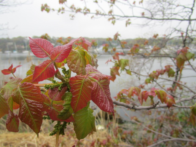 - This tiny patch of woods displays skunk cabbage in a bog surrounding a tiny remnant outlet into what were once wetlands, now bounded by centuries of various dikings, embankments, and dams. Already an adventure to get to, because poison ivy is springing up everywhere on the forest floor, delicate tiny red leaves and vines not yet impenetrable, but dangerous to those with allergies nonetheless. I’ll have to be careful about touching the cuffs on my jeans for a while.