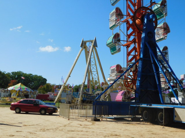 Mike is staring up at some of the carnival equipment parked on the Hecksher ballfield. Trucks have left huge mysterious structures everywhere, waiting to be unfolded, unpacked, and plugged in. Columbus Day is always marked by the Huntington Fall Festival.
