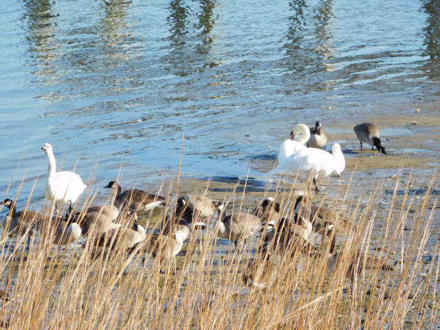 Large crowds of flocking geese _ not the usual overwintering kind _ have arrived to cover the bay, ignoring the massed swans who dislike the competition for fresh water. A few ducks, but not so many as to be noticeably different from other times of year.