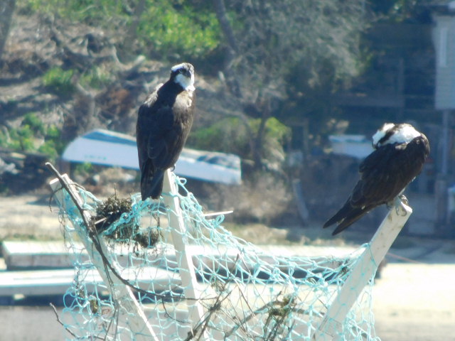 Two confused ospreys, after their nest was cleared off a boat by the owner.