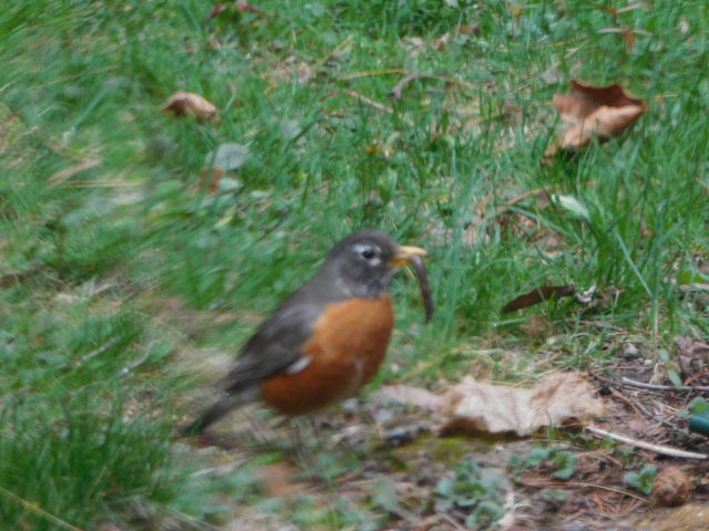 Busy robin munches away at something, or maybe just gathering for a nest. It wouldn’t answer my questions.