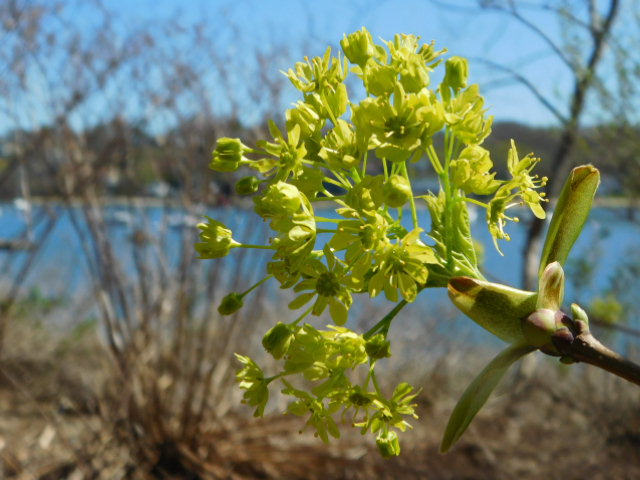 Maple flowers adding to high sneezable pollen invisible in clear cool air.