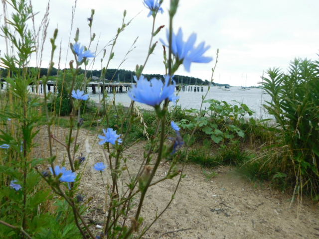 Chicory lovely blue blossoms before noon, brightening a chill moist stroll.