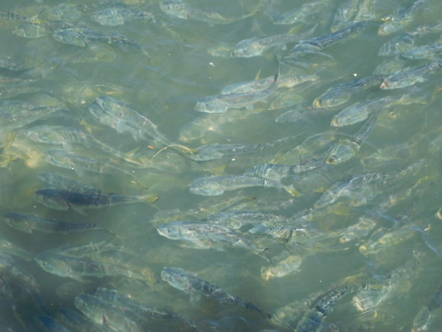 Fish clustering in thousands at head of harbor presumably trying to advance up streams that have been dammed.
