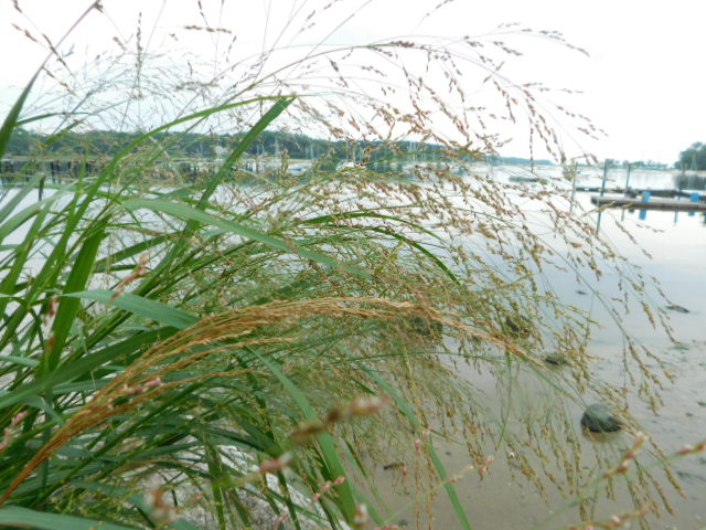 Grasses ripen almost invisibly in various nooks along a high stone seawall.