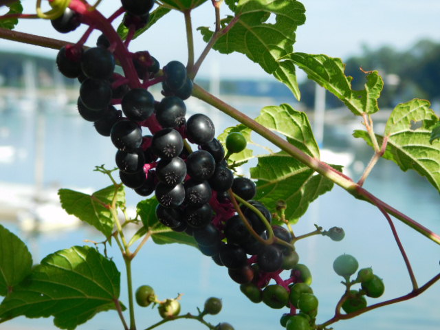 Lovely purple bunches of ripe pokeweed rarely survive bird appetites for very long.