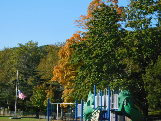 Usually flaming tree at Mill Dam park shows subdued hues this year.