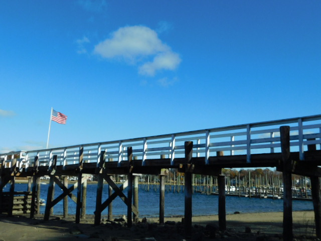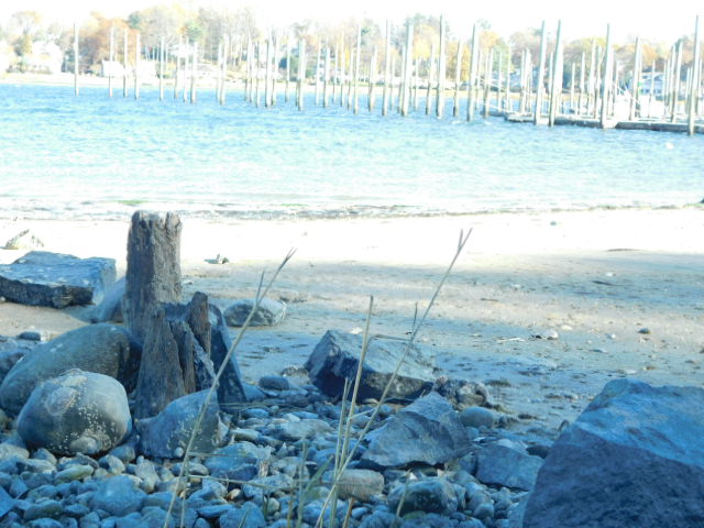 Low tide exposes rocks and old pilings, reminding us of spare months to come.