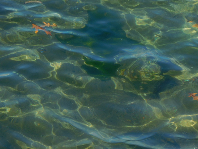 Crystalline waters free of algae with a few floating leaves reflect impossibly complicated possible patterns.