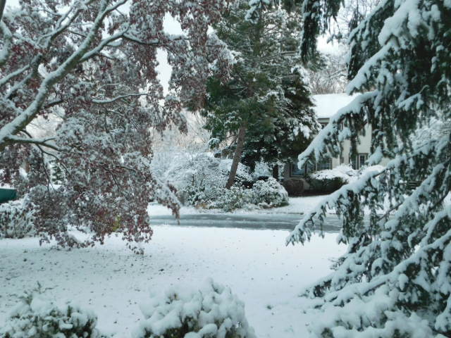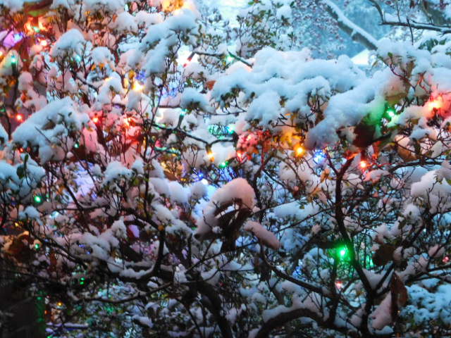 Outside lights barely penetrate heavy wet snow after another few inches wear out winter’s immanent arrival.