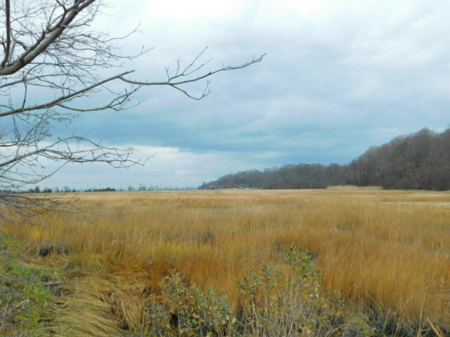 Salt meadows have turned gold, accented under dark blue storm clouds.