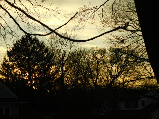 Low orange light lines a dark solstice horizon, with harbor lighthouse hulking behind bar branches.