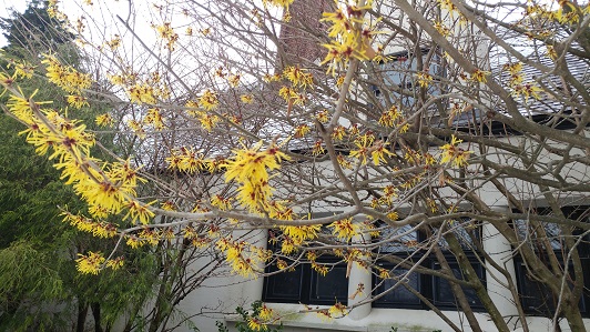 Witch Hazel at the Unitarian Church extends bloom in a cold season.