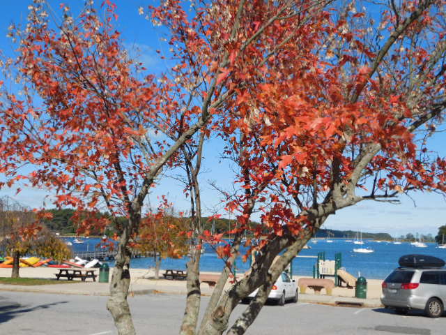 Borderline between summer and autumn, bright leaves overlook an empty beach with green trees on horizon.
