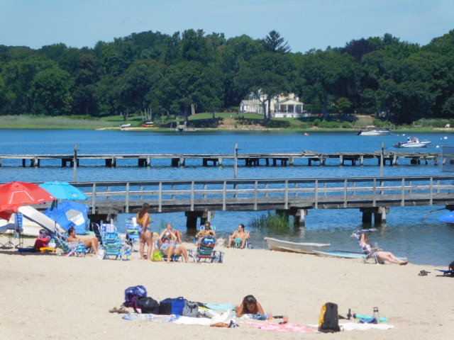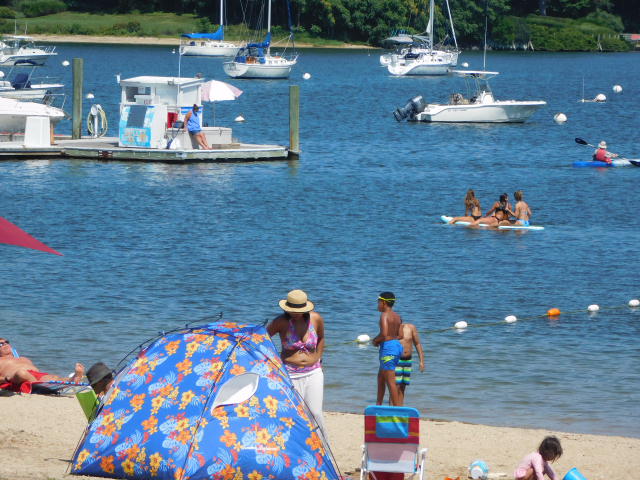 Heat wave has temperature in lingering humid nineties; with many others I sit on the local bay beach, dipping in every few minutes as I overheat while enjoying the scenery. Children and grandparents and couples, and teenagers, and parents, and solitary old people mill around, splash, or sleep. If a few of them were digging clams, I could almost believe myself back in the social environment of the late Pleistocene, on summer shores before bathing suits were necessary or invented.