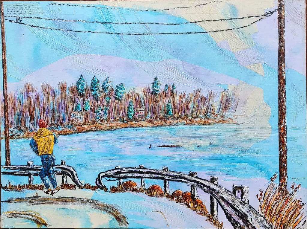 Along harborrun time passes/like empty cold wind/pale sun behind racing clouds/I force myself against inertia/with the jogger, defying winter sleep.