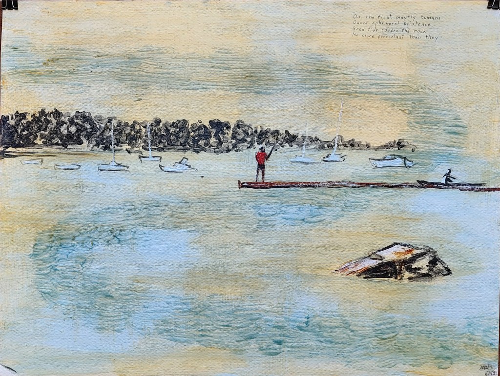 On the float, mayfly humans / dance ephemeral existence / soon tide covers the rock / no more persistent than they