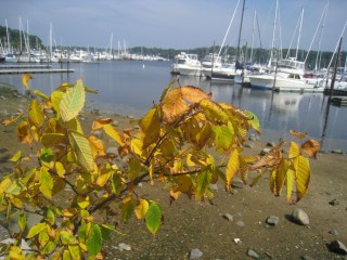 The next two weeks are peak colors around here, what there is of it along the harbor. The vines go first, like this one draped along a fence. The locusts are mostly bright yellow, everything else _ not so much. Upland a bit _ say at Hecksher park _ there are a few bursts of brilliance.